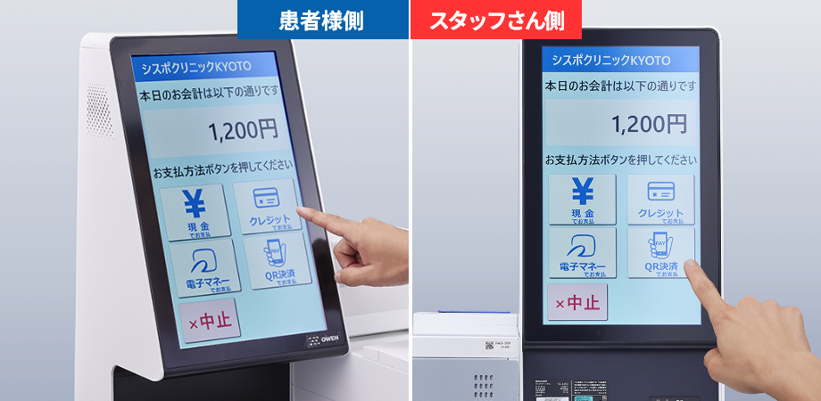 セミセルフレジOWENは、大画面で文字が大きく、操作もシンプル。患者様はもちろんクリニックのスタッフさんにも優しいセミセルフレジです。